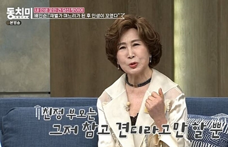 배인순은 시댁과의 고부갈등과 남편의 외도 사실에 대해 토로했습니다. 결혼 당시 젊은 나이에 시어머니가 너무 무서웠고 부부생활은 크게 나쁘지 않았다고 고백했는데요. 하지만 남편의 외도에 대해서도 입을 열었다고 합니다.