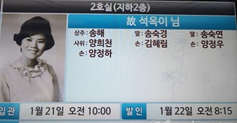 송해의 부인은 2018년 송해와 함께 독감으로 인한 폐렴으로 입원했으나 병을 이기지 못하고 사망하였습니다. 아내의 장례식장에서 슬픔을 감추지 못하는 모습을 보였습니다.