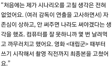 컴맹이어서 고생했던 일화를 얘기하기도 했는데요. 영화 시나리오를 작업하던 당시 몇 번이나 시나리오가 날아가서 큰 고생을 했었다고 하네요.