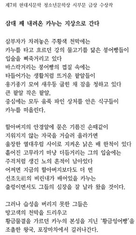 시 쓰는것을 어린시절부터 즐겼다는 장동윤은 나중에 시집을 내는것을 원한다고 밝혔습니다. 고등학교 2학년인 2009년 시부문 중고등부에서 '삼대 째 내려온 카누는 지상으로 간다'라는 제목의 시로 금상을 수상하였습니다.