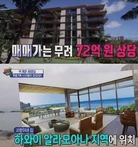 하와이 집은 방송을 통해 공개 되었는데요. 약 75억 4천만 원 정도라고 하네요. 월 관리비만 300만 원일 정도로 고급 거주지라고입니다. 크기는 65평으로 추정됩니다.